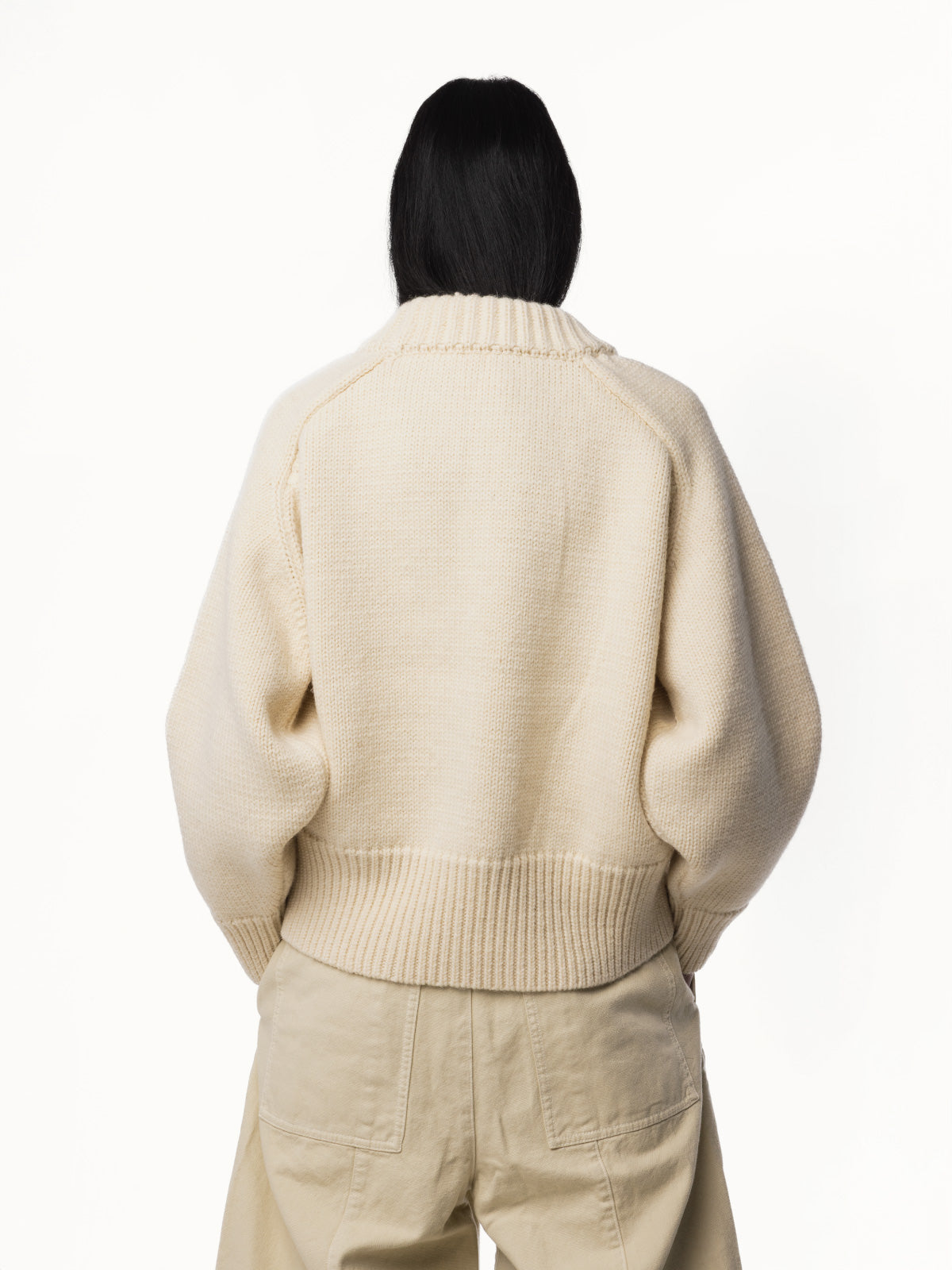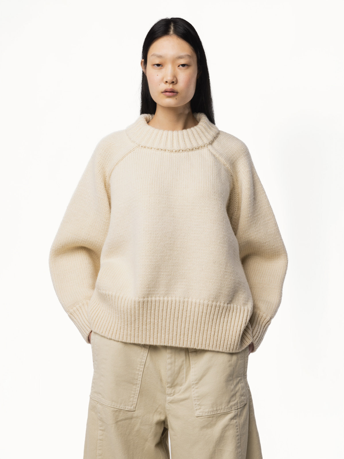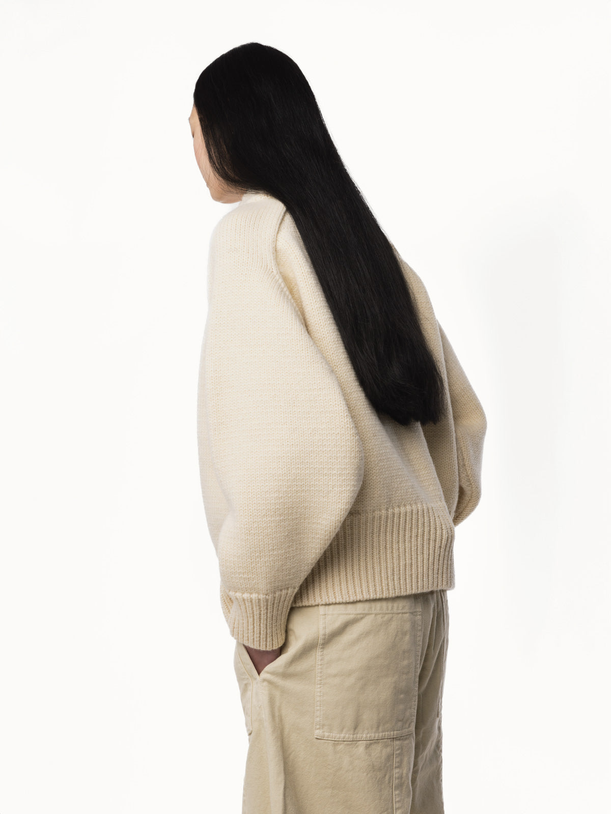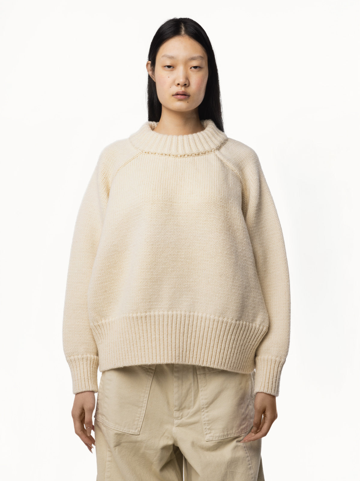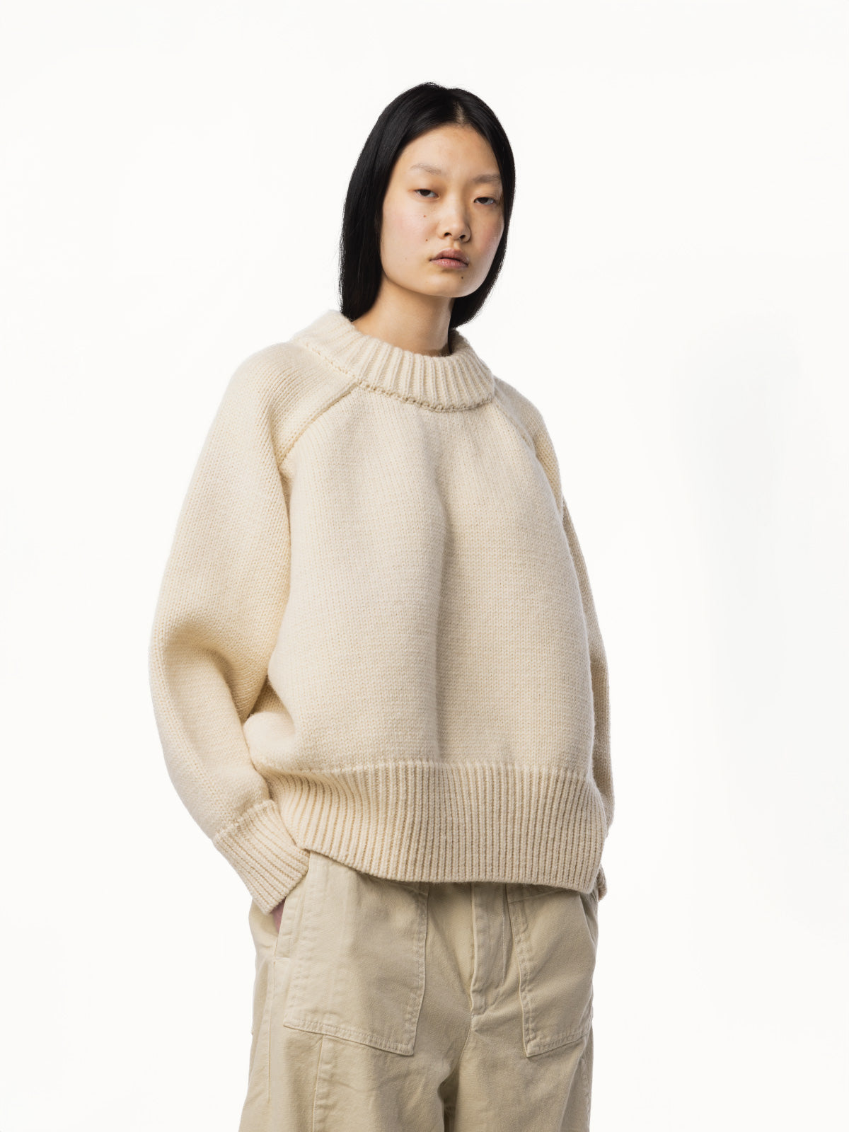 Our sweaters weigh nearly double that of standard luxury knitwear (approx 1.2kg) the equivalent of one sheep’s fleece harvest for the year. To wear one is to be wrapped in the coat of a whole sheep - you can feel the warmth in the density and drape.